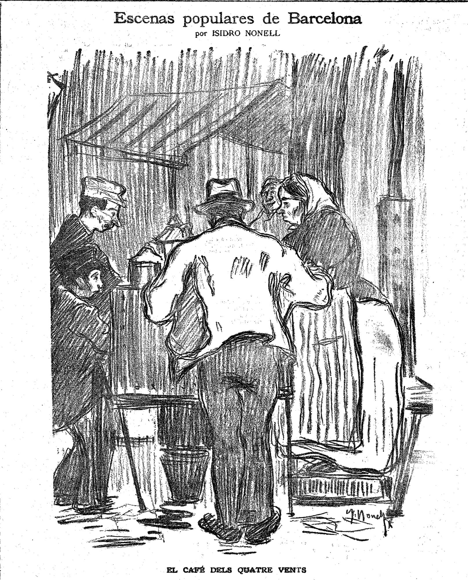 A finals dels anys quaranta, a causa de la manca de fonts, apareixen a la Barceloneta els aiguaders, que es dediquen a passejar amb un carretó oferint aigua. En poc temps, amplien la seva oferta a orxata, gasoses, cerveses i altres refrescos, i també cafè. Les dècades següents passen a formar part del paisatge de la ciutat, sobretot als molls, on evolucionen i esdevenen barraques i quioscos on també s’hi ofereixen viandes a preus populars. Eufemísticament es coneixen com a «cafès dels quatre vents».