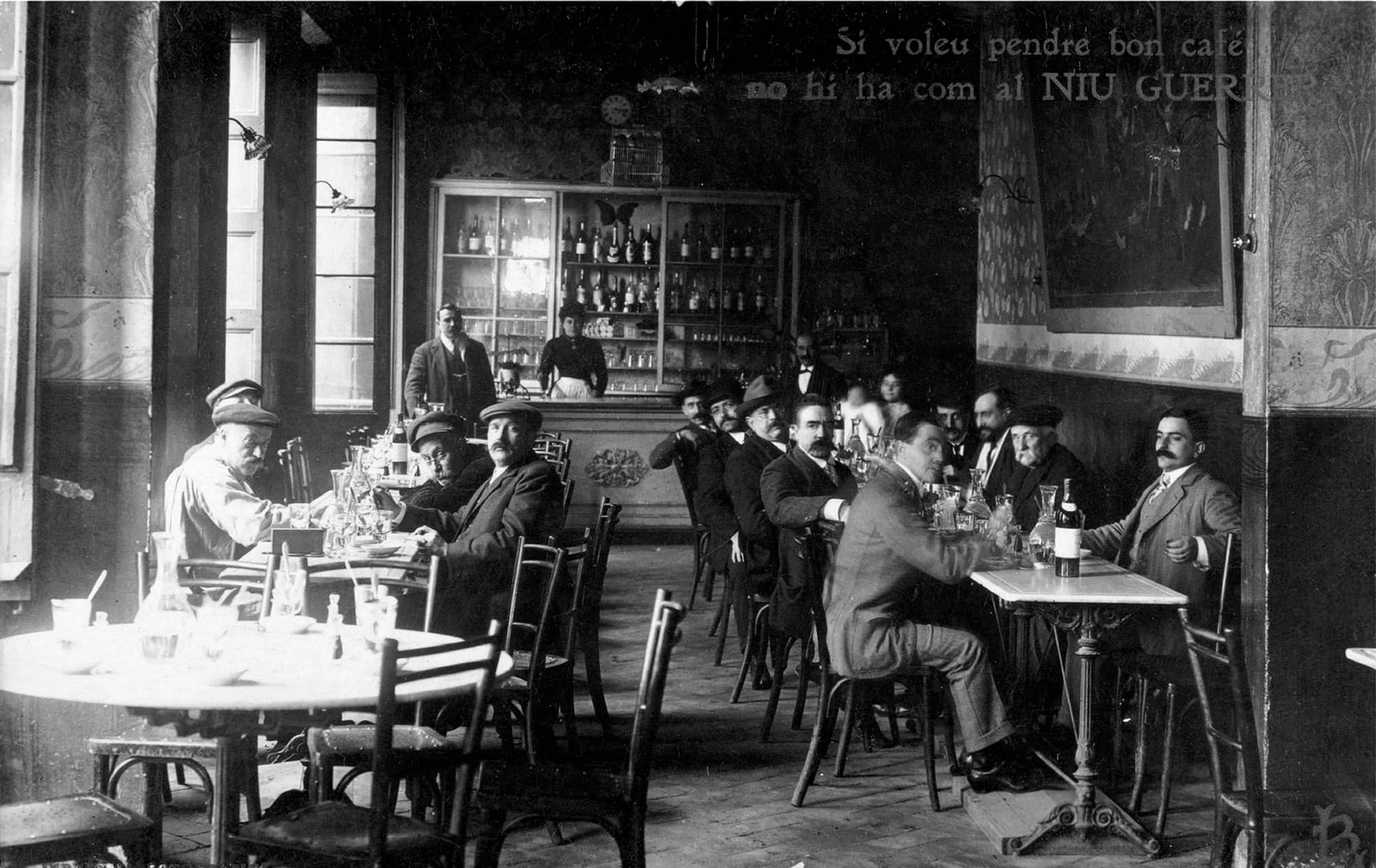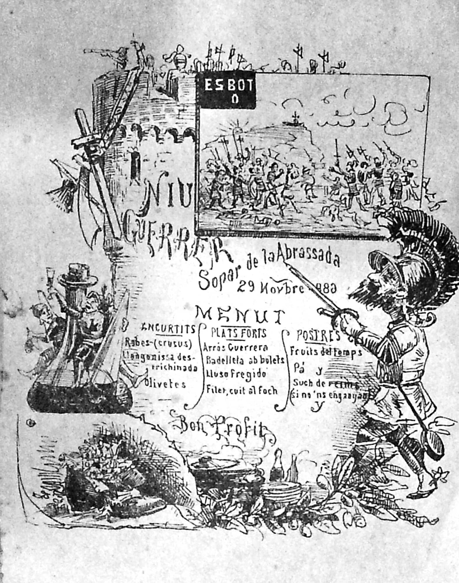Durant la segona meitat de segle, neixen nombroses societats humorístiques i recreatives on la gastronomia té un protagonisme especial, com la «Colla de l’Arròs» (1856), amb una cassola com a estendard, o «Lo Niu Guerrer» (1874-1936), amb el seus cèlebres tiberis i fontades, que es prodiga precisament en aquest aspecte: la seva litúrgia està farcida de simbologia culinària i als nombrosos àpats que realitzen els plats són presentats amb noms sarcàstics i irònics, enllaçant directament amb la tradició conreada a les fondes de sisos.