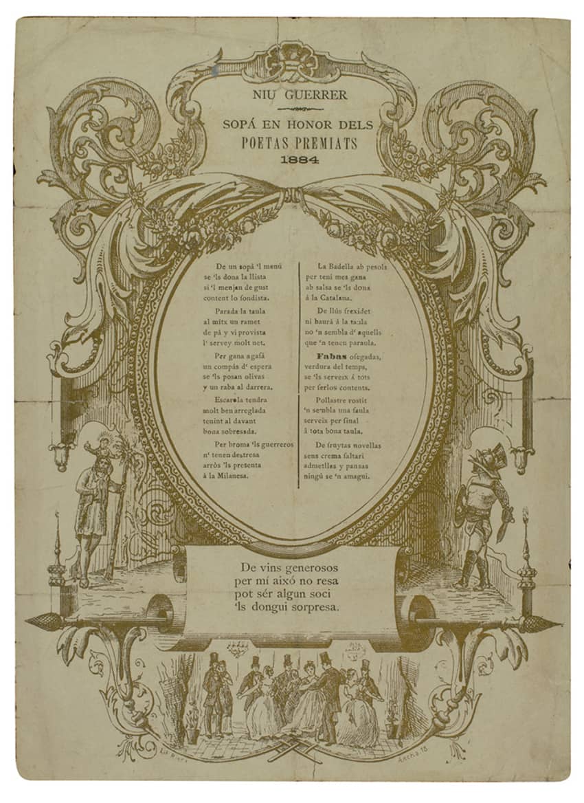 L’eclosió de la cuina catalana la segona meitat del segle XIX queda ben reflectida en la literatura del moment, sobretot en la literatura de caire popular i vulgar. Es fa palesa una «tendència a incloure a les obres referències culinàries, a la premsa (satírica sobretot), els sainets populars, les comèdies, els romanços, les auques, les corrandes se’n feien ressò, sobretot a Barcelona i València, de plats, àpats, mesclant satíricament elements gastronòmics i actualitat social i política.» (FÀBREGA 2015) Així doncs, fondes i becos són escenaris per a desenvolupar trames dramatúrgiques; comensals, cuiners i cambrers en són protagonistes; i les menges que s’hi serveixen, n’esdevenen l’attrezzo idoni.